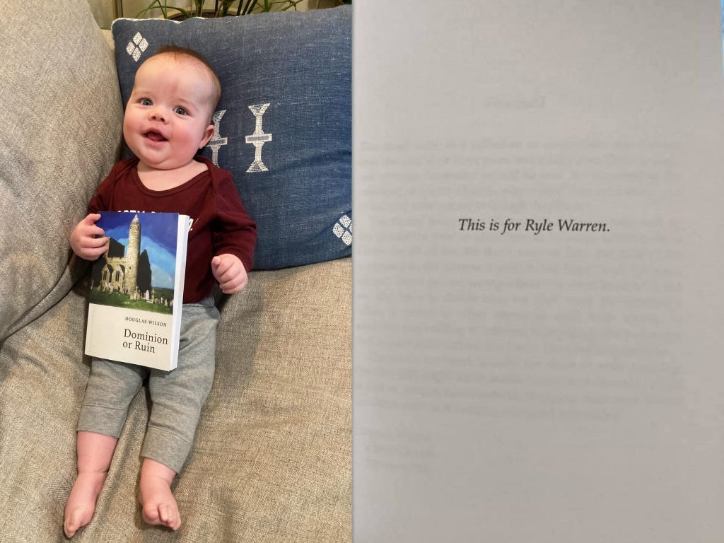Honorable mention: Dominion or Ruin by Douglas Wilson. This is the first book I've created with Pastor Doug, and he was kind enough to dedicate it to our son, Ryle. Also Tara designed the cover.